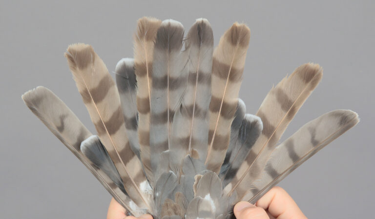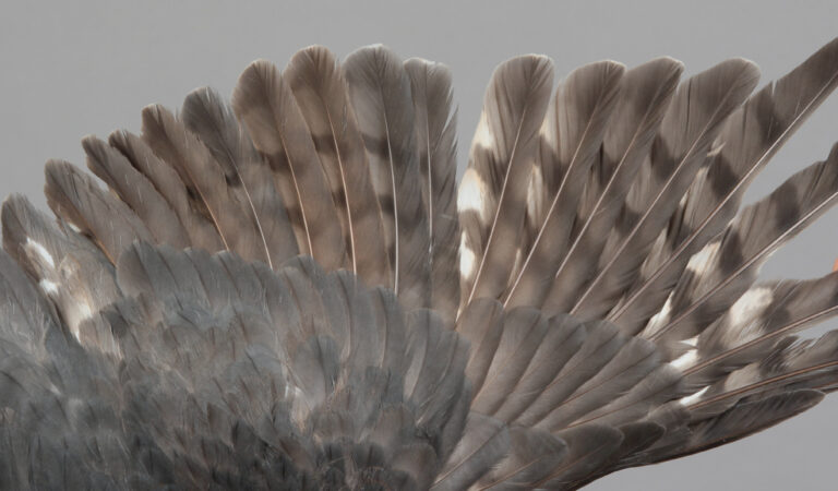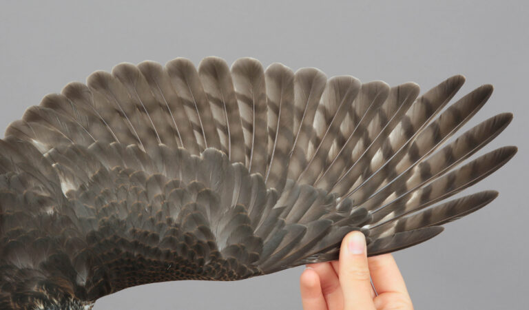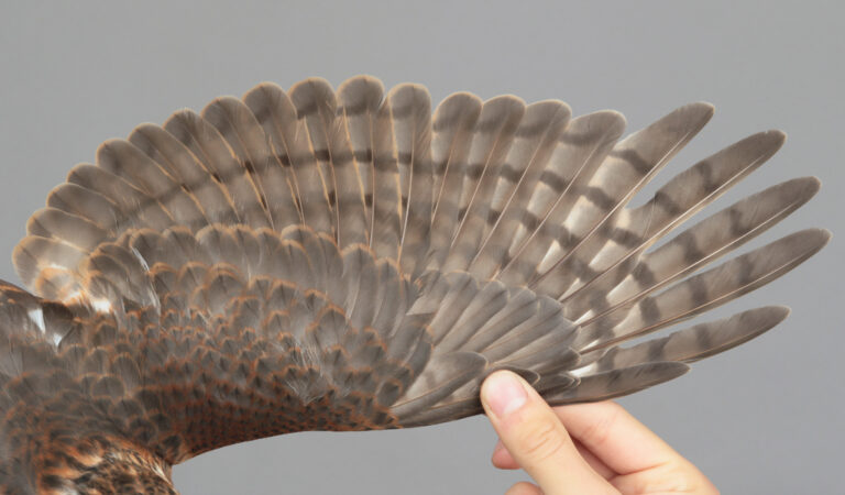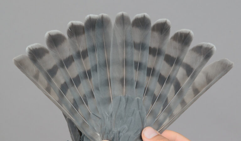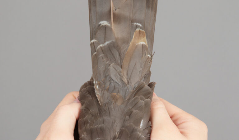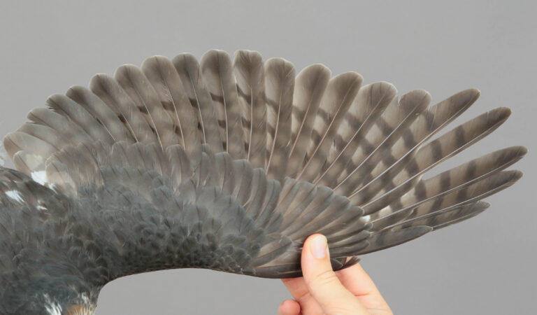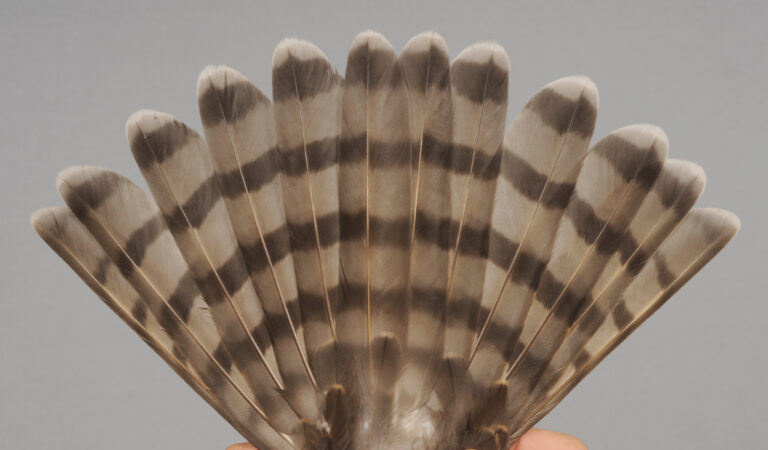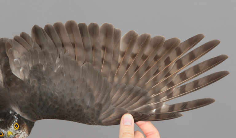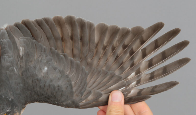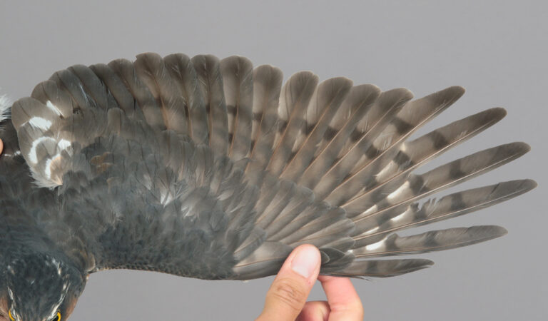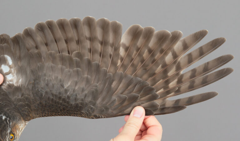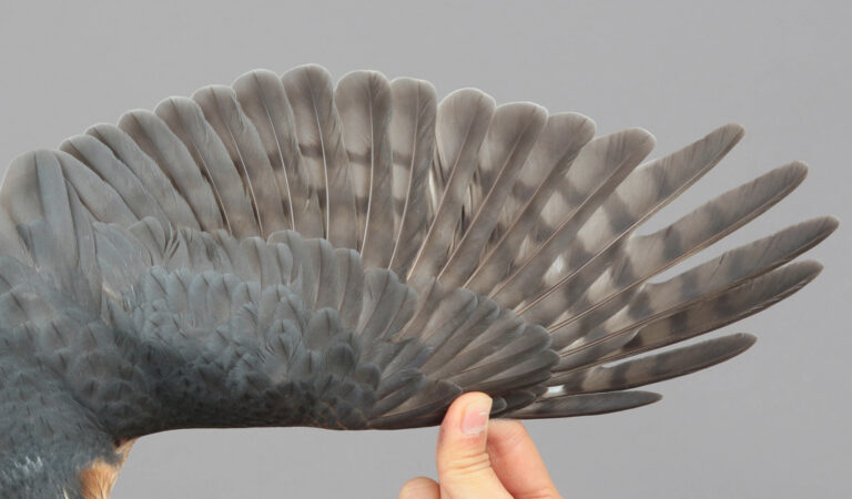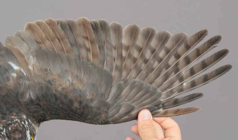 2cy female, September. An example of an individual showing retained juv feathers: S8 (brown in colour, worn edges, different barring pattern) and several LC (brown in colour, very worn, with the buff edges mostly worn away, except for in a couple of protected feathers close to the body). [6224995]