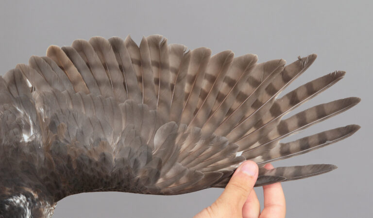 2cy female, September. A bird in active post-br moult showing many still retained juv feathers: 4 SS (showing much a higher level of wear and a difference in length and barring pattern to the ad SS), as well as some MC, many LC, P1, body feathers, etc. Note that due to timing and sequence, the moult has also created striking bleaching differences between the ad SS of the same generation (for example, compare S5 to S6). [6440274]