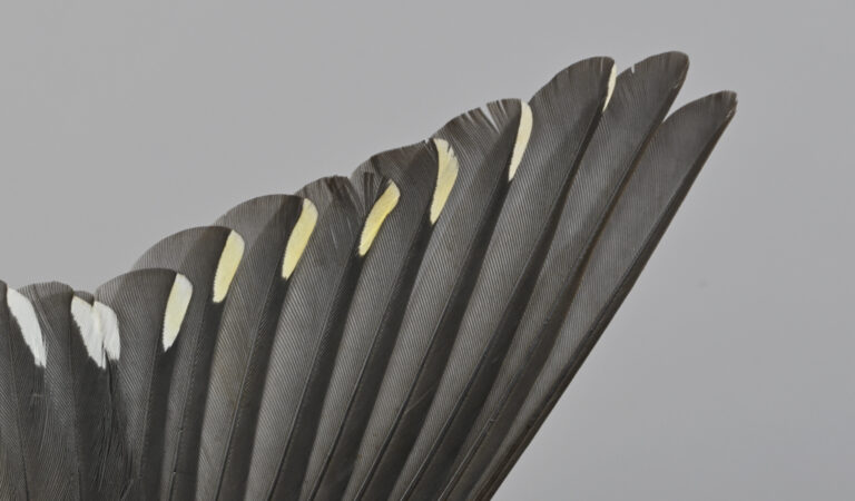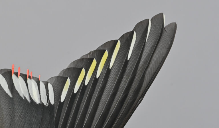 2cy+ (3cy+?) Male, November. SS5-6 retained (as a result of an arrested complete moult). The retained SS are more worn and bleached than the new feathers around them, but clearly in much better condition than the retained SS in the previous example [3630975]. In addition, the waxy tips are the same size in the retained SS as in the moulted SS. Therefore the retained SS are most likely of a worn ad generation which would make the bird a 3cy+. [3630995].