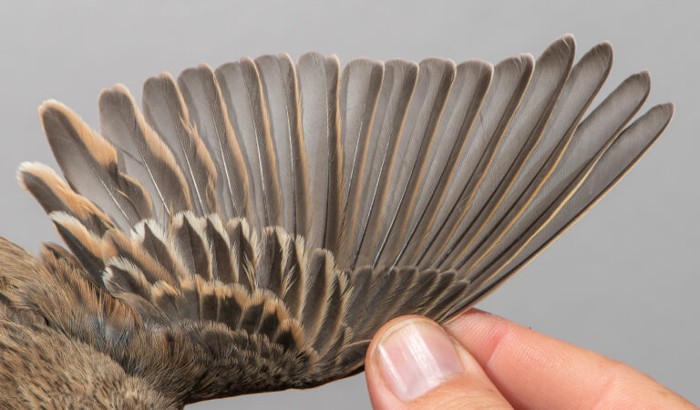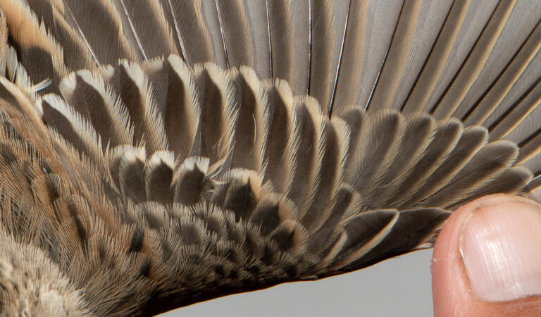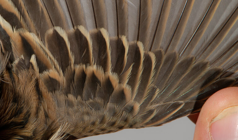 2cy+ September (Mongolia). Much of wing fresh pre-br, but note suspension with retained and worn SS, innermost AL, most MC and a few LC. [90764551]